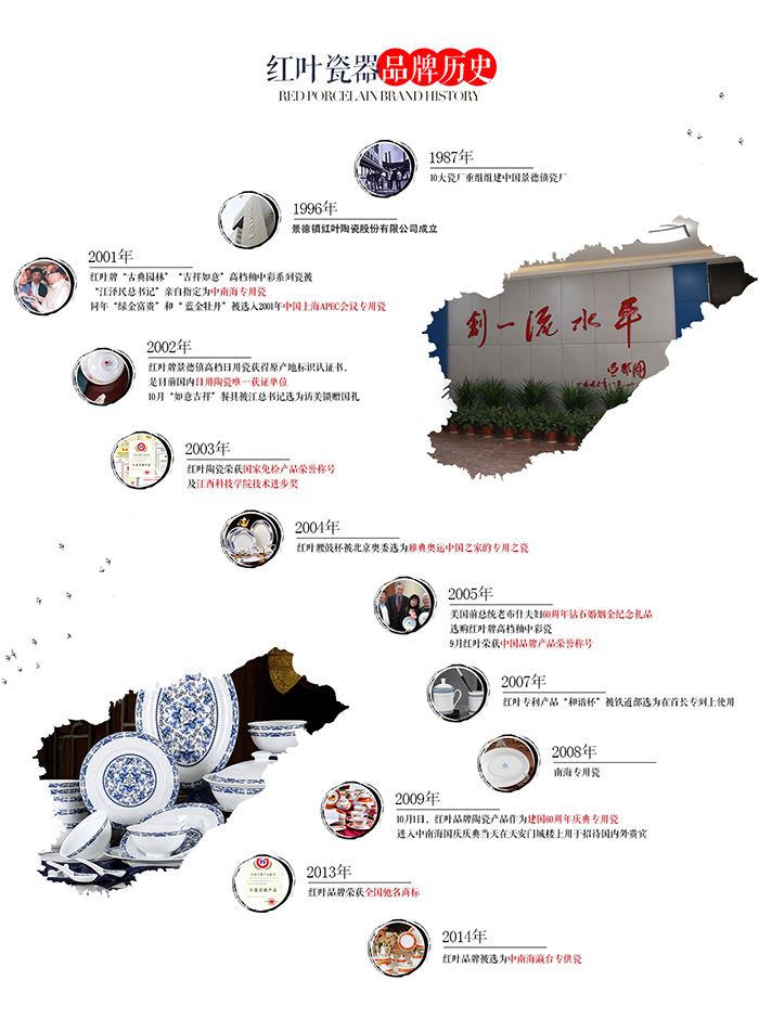 公司于2002年通過ISO9001:2000國際質(zhì)量體系認證,為拓展國際市場奠定基礎(chǔ)。"紅葉"牌高檔細瓷取得了國家質(zhì)量監(jiān)督檢驗檢疫總局頒發(fā)的原產(chǎn)地標記注冊證書。