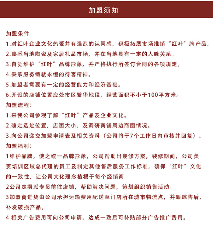 良禽擇木而棲,我們熱忱歡迎各界熱愛紅葉陶瓷且備具一定經(jīng)濟實力的有志之士,加盟“紅葉”,與我們一起共同創(chuàng)造景德鎮(zhèn)紅葉陶瓷股份有限公司的美好明天。