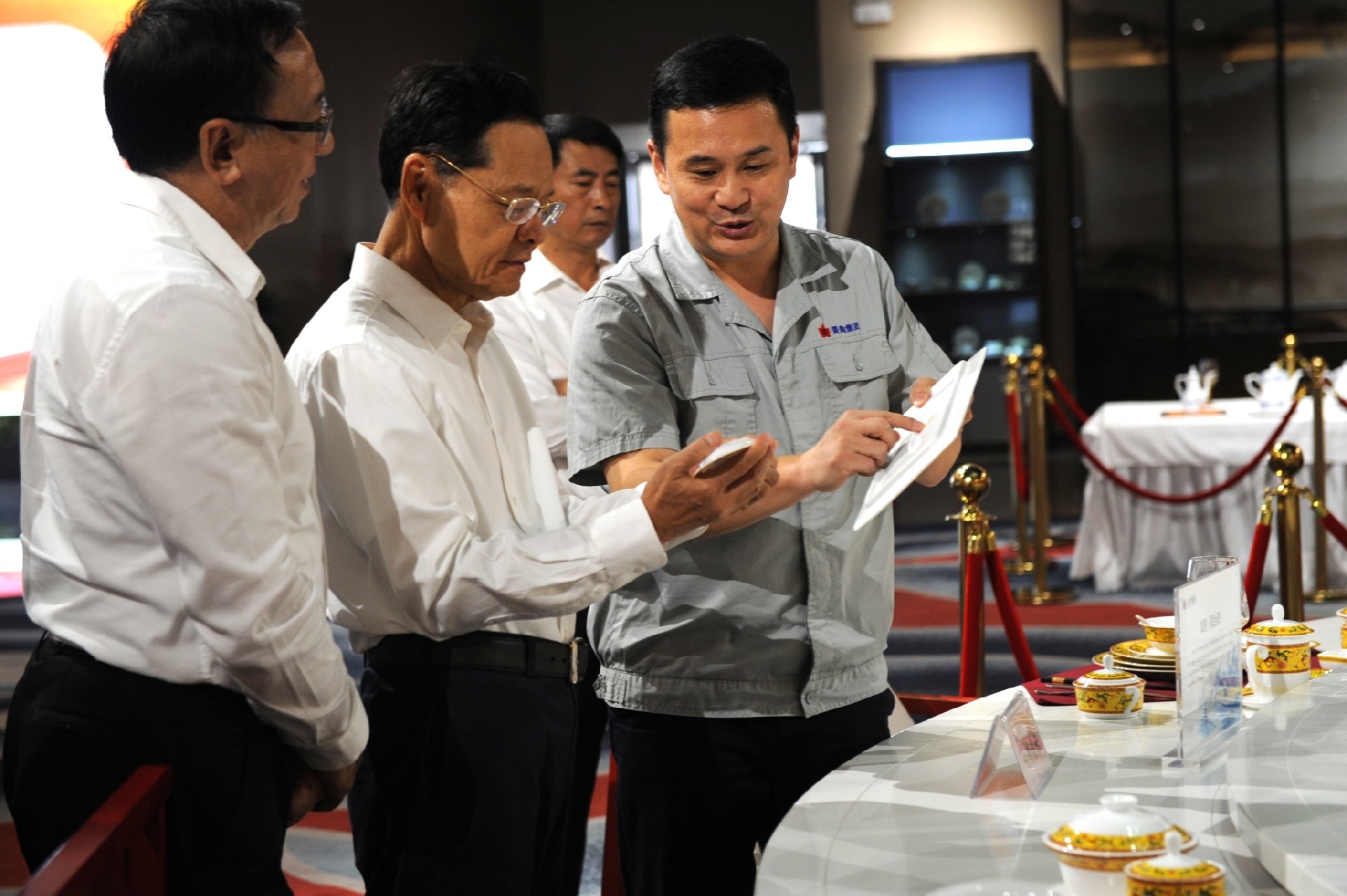 走進國瓷館,鄧景揚向陳武一行介紹了集團的基本情況,國瓷館展廳規(guī)模。鄧景揚介紹說,“國瓷館”是目前全世界最大的單一品牌陶瓷展廳。參觀時,陳武興致勃勃地拿起桌上的一套產品仔細端詳,鄧景揚適時介紹到:“這是我們新開發(fā)的一款產品,是一套組合餐具,該產品將日用陶瓷和藝術陶瓷巧妙結合,合起來是一個花瓶的造型?!薄斑@個不錯,有創(chuàng)意!是紅葉品牌嗎?”陳武問道?!斑@是我們集團旗下一個“百花”品牌的產品。”隨即,鄧景揚向陳武介紹了景陶集團發(fā)展脈絡和以“國瓷紅葉”為主打品牌,金品陶、百花、家好系統(tǒng)品牌特色,集聚綻放的特點。期間,鄧景揚講述了“紅葉”與“御窯”前世今生的關系和如何將“紅葉”產業(yè)和陶瓷文化進一步做大做強制定的新的發(fā)展愿景。鄧景揚介紹道,“我們集團的發(fā)展愿景是做世界上最精美的瓷器,創(chuàng)百年一流企業(yè),讓‘紅葉’成為世界知名的日用陶瓷中國民族品牌,用陶瓷講好中國故事,展中華文化風采,讓‘紅葉’成為中華文化走向世界的文明使者?!标愇渎牶蟊硎臼终J可和贊同,并勉勵景陶集團進一步發(fā)揮好景德鎮(zhèn)陶瓷龍頭企業(yè)的帶頭作用,讓紅葉陶瓷真正走出去。