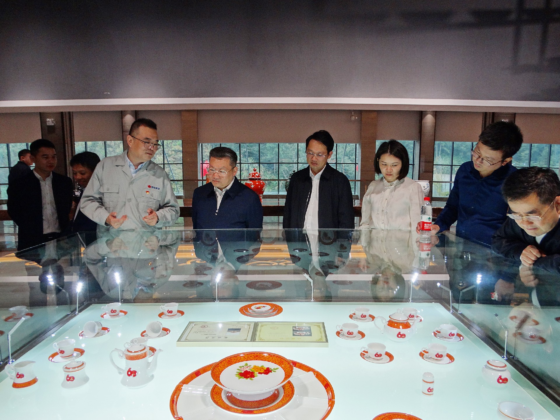在國瓷館,胡軼向陳澎一行講解國瓷館內(nèi)的基本情況和產(chǎn)品特色。大家一路走一路看一路聽,胡軼向重點(diǎn)介紹了“新中國成立60周年國慶慶典天安門觀禮臺專用瓷”、“‘瀛臺夜話’接待外國元首用瓷”、“古典園林”、“首長專列用瓷”等。一個個國瓷故事和工藝細(xì)節(jié),引得眾人贊嘆不已。陳澎還仔細(xì)詢問了企業(yè)生產(chǎn)經(jīng)營、對外貿(mào)易等情況。