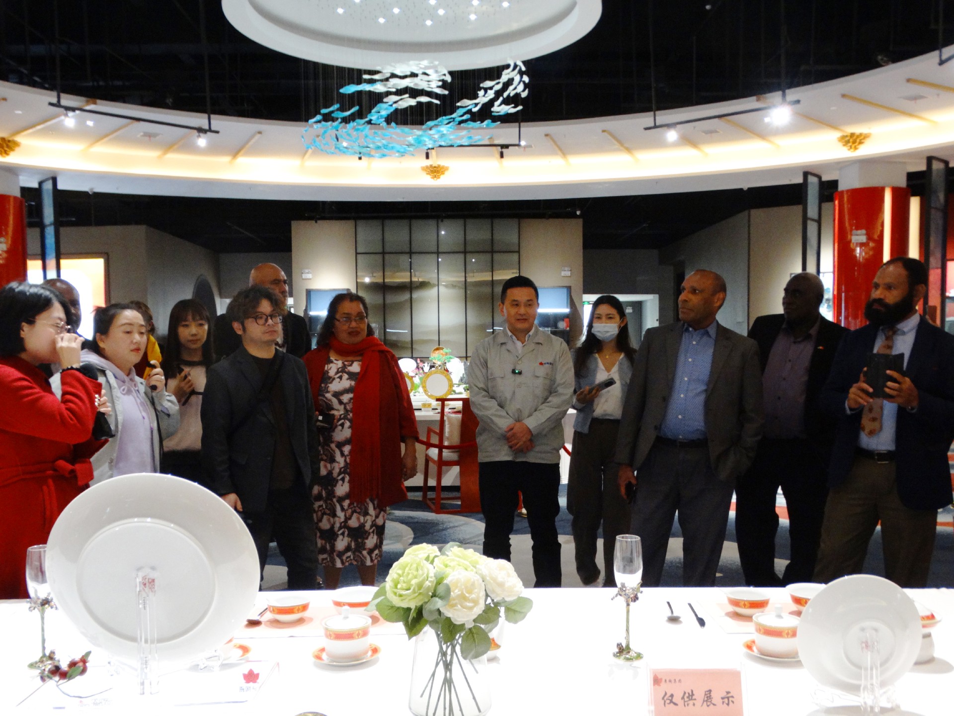 在國瓷館國宴大廳,研討班一行在講解員的帶領(lǐng)下近距離感受“國瓷紅葉”的中國文化,聆聽“國瓷紅葉”故事,了解“國瓷紅葉”工藝特點。當(dāng)聽到“這套‘新中國成立60周年國慶慶典天安門觀禮臺專用瓷’,2019年在上海拍賣會上拍出138萬的價格”時,大家紛紛豎起大拇指,贊嘆不已。當(dāng)看到心儀的“國瓷”時,大家都不約而同地問道是否可售。鄧景揚介紹說,有部分“國瓷”在我們的銷售區(qū)是有同款的。在了解價格后,大家都驚嘆精美的“國瓷”不僅尋常百姓家能用到,也用得起。